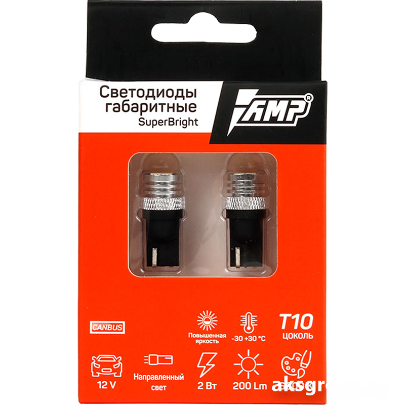 - Светодиод габаритный SuperBright T10 CANBUS Флагман в линейке габаритных и салонных диодом АМП. Обладает 4мя сверхяркими диодами со световым потоком в 200 Люмен. Присутствует алюминиевый радиатор охлаждения. Также для установки в современные автомобили содержат в себе CANBUS «обманку», благодаря которой электроника большинства современных автомобилей работает корректно и без ошибок.ХарактеристикиОбманка: естьОхлаждение: алюминиевый радиаторНапряжение: 12 ВМощность: 1,8 ВтСветовой поток (яркость): 200 Lm